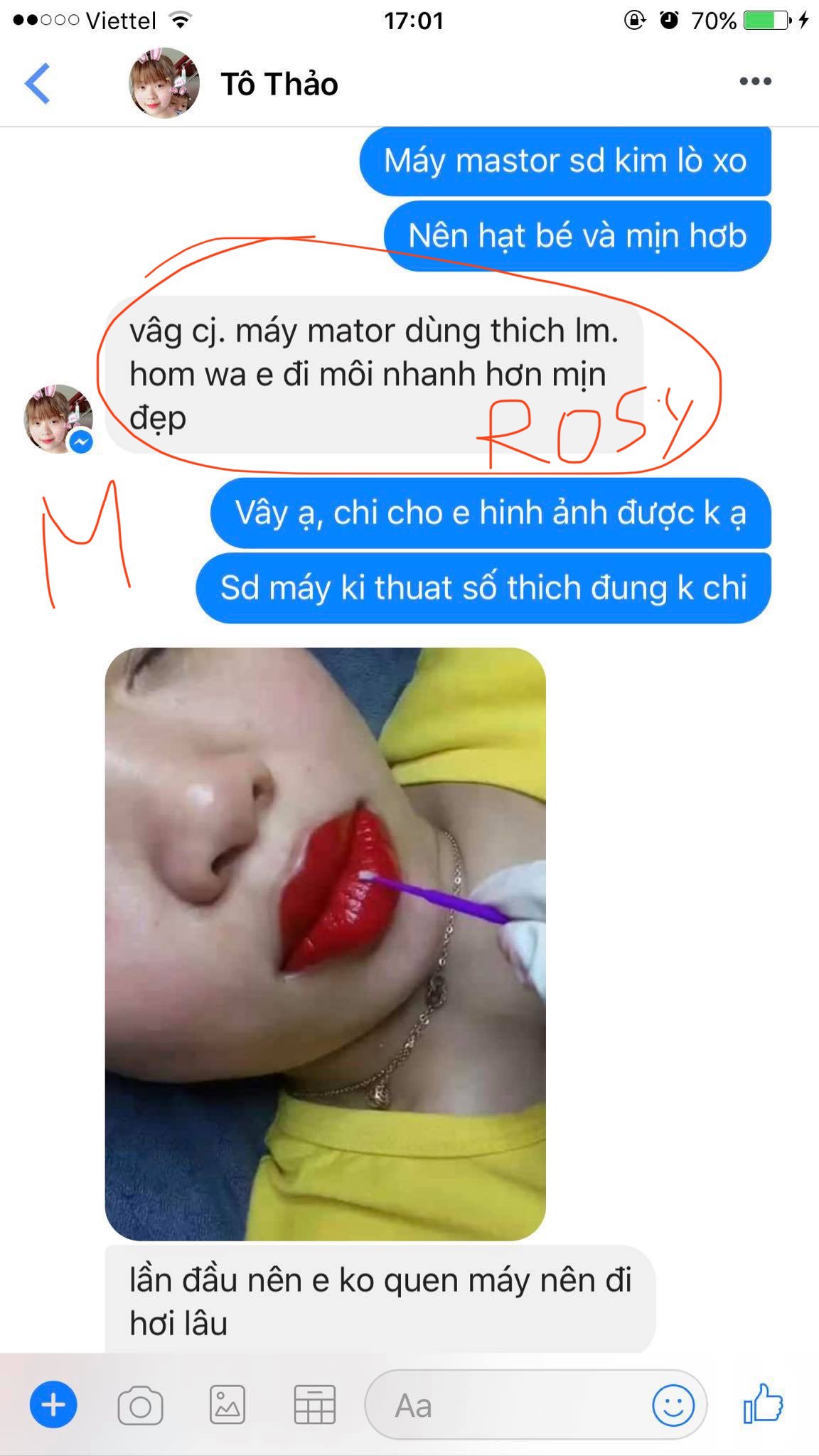 (Trong ảnh cô đang dùng máy, mực và các phụ kiện khác của Mastor thực hiện kỹ thuật phun hồng nhũ hoa)